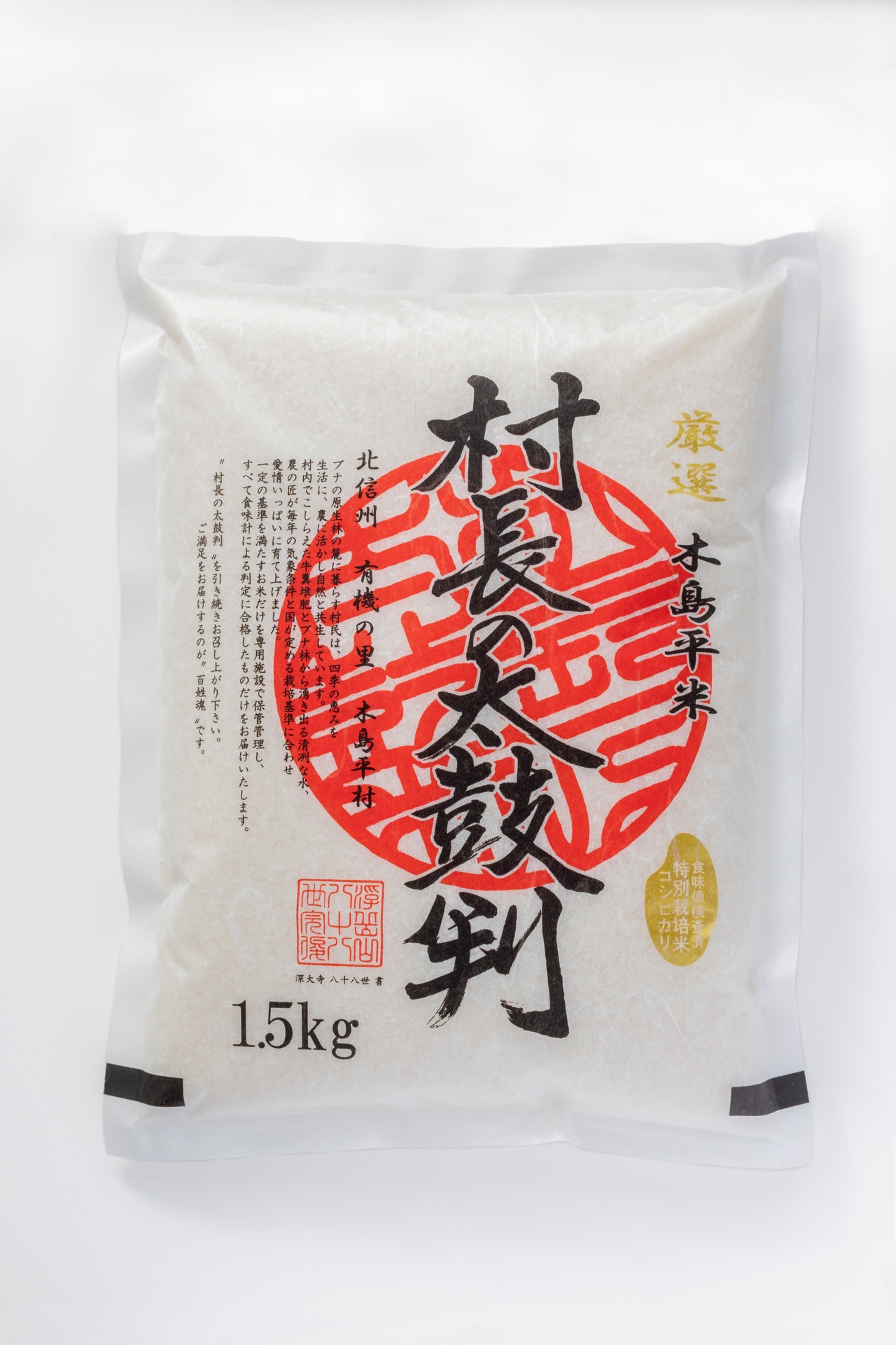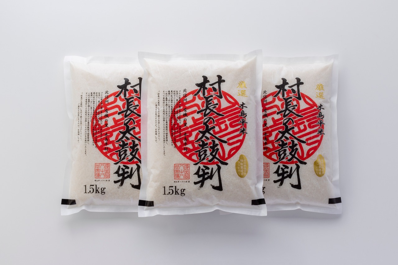 木島平村は米のオリンピックと呼ばれる「米・食味分析鑑定コンクール:国際大会」にて9年連続金賞に輝いた米の優良産地です。平成29年度には、5年連続国際総合部門で金賞を受賞した団体に贈られる「ゴールドプレミアムライスAAA(トリプルA)団体」に木島平米ブランド研究会が認定されました。そんな木島平産コシヒカリの中でもより高品質な米だけを厳選したものが「村長の太鼓判」です。